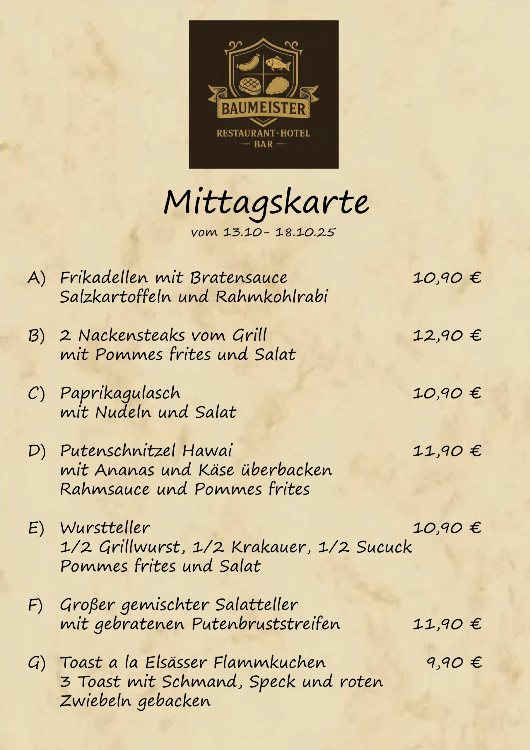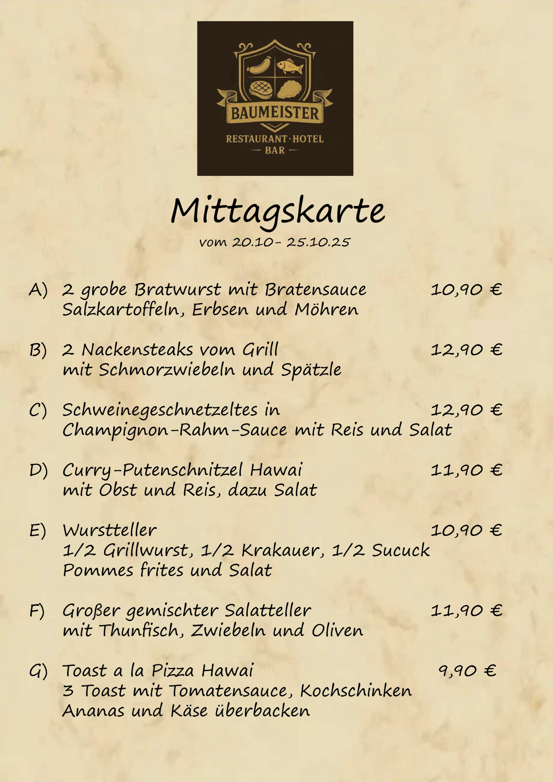 MENU Köstliches Menü Mittagtisch vom 13.10 bis 18.10 von 11.30 Uhr bis 14.30 Uhr Mittagtisch vom 20.10 bis 25.10 von 11.30 Uhr bis 14.30 Uhr